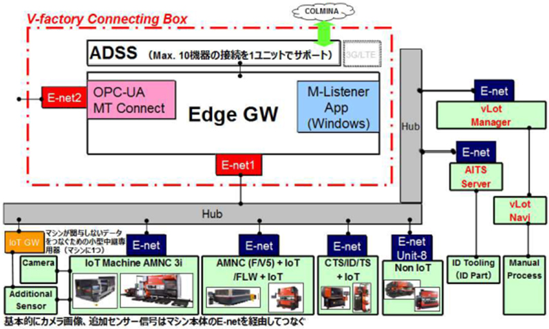 「V-factory Connecting Box」は、マシンからのセンシングデータや稼働ログデータを、安全かつ安定したネットワークで取得する機器であり、お客さまとアマダをつなぐ重要な役割を担います。富士通の「FUJITSU Managed Infrastructure Service FENICSⅡ M2Mサービス」を用い、高いセキュリティーを確保したネットワークにより、モノづくりのあらゆる情報を連携させるプラットフォーム「FUJITSU Manufacturing Industry Solution COLMINAプラットフォーム」にてデータの蓄積や分析を行います。また、OPC-UAとMT Connectのデータ交換標準規格にも対応し、アマダとのつながり以外の、オープンな情報連携を可能にする機能を備えています。