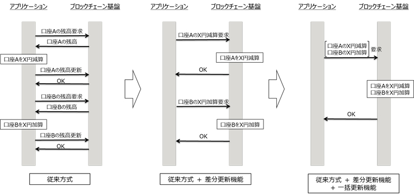 図2: 差分更新機能および一括更新機能による通信回数削減 (口座AからBへX円送金する場合)