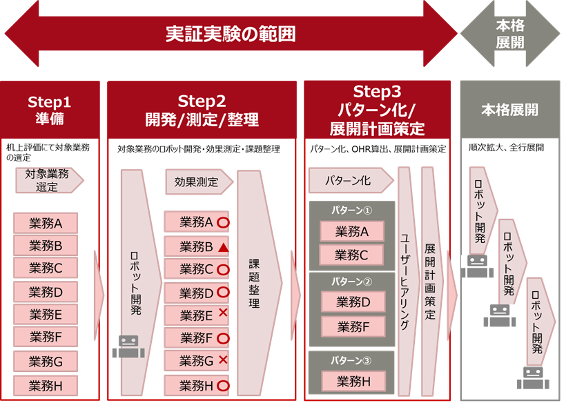 Step1 : 準備 机上評価にてRPA適合性があると見込まれる対象業務の選定 Step2 : 開発・測定・整理 Step1で選定した対象業務において「Kapow」をベースとしたロボット開発・効果測定・課題整理 Step3 : パターン化・展開計画策定 Step2で高い効果があった複数の対象業務を類似業務に分けてRPAを共通的に適用するためのパターン化、OHR(注2)算出、展開計画策定