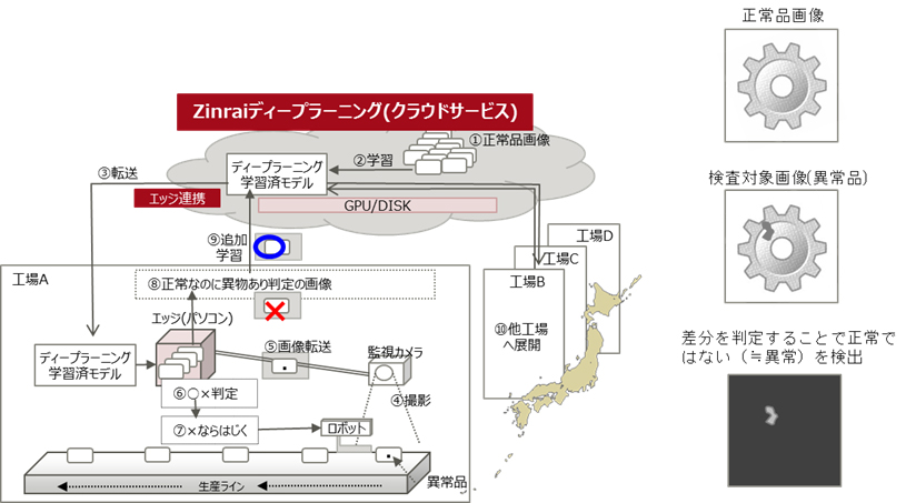 主に製造業のお客様を対象として、生産ラインを流れる製造品の異常検知作業の標準化・効率化を行うために、「FUJITSU Cloud Service K5 Zinraiプラットフォームサービス Zinraiディープラーニング」による画像認識の技術を活用して、正常品の画像だけを学習させ、欠陥品を自動的に検知します。また、全ての工場において同一のディープラーニング学習済モデルを利用することで、異常検知の判断基準を標準化することが容易になるだけでなく、各工場から収集された様々な画像データを追加学習することにより、学習済モデルを継続的に成長させることができます。