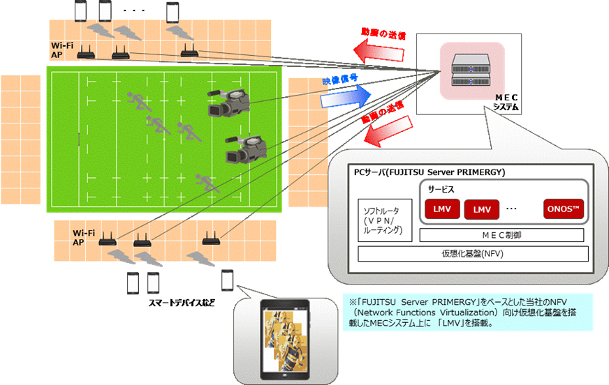 本検証では、TBSとWOWOW、NIXUSが中心となって開発した、イベント会場の複数のライブ映像をモバイル端末などで視聴可能にする映像配信ソフトウェア「Live Multi Viewing」(以下、LMV)を当社独自の制御システムなどを搭載したMECシステム上に搭載します。会場内の複数のカメラからMECシステムに送信されるライブ映像を、会場に設置されたWi-Fiアクセスポイントを介して観客のスマートデバイスにリアルタイム配信するシステムの技術的な検証を行います。これにより、観客は様々な角度からのライブ映像や選手情報などから好みのものを視聴することが可能になります。