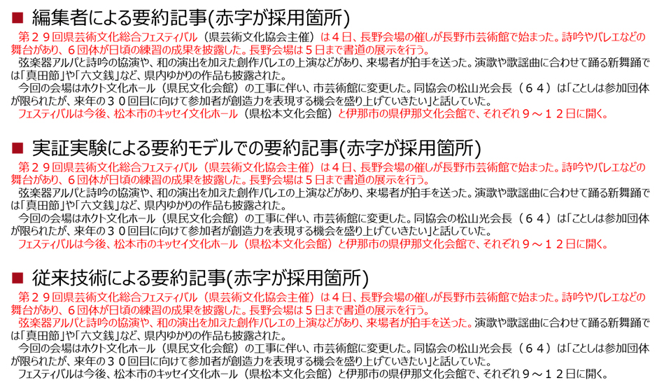 信濃毎日新聞社の過去記事と、それらを人手で要約した記事をセットにした合計約2,500セットの記事を自然言語処理および機械学習させることでモデル化し、CATV向けニュース配信サービスに最適化された要約記事を自動作成できる自動記事要約システムを構築しました。本システムを利用して記事を自動要約することにより、人手では記事1件当たり最大約5分かかっていた要約を瞬時に行うことが可能になります。また、従来の自動要約手法であるLEAD法では、文字数制限に応じて文章の先頭から機械的に抜粋して要約記事を作成するのに対し、本システムでは記事先頭以外からも重要文を抽出して要約を行うため、人手と同じように精度の高い要約記事を作成することができます。本システム完成後、過去に配信された一般社団法人共同通信社(注4)の「ニュースパック」(注5)を要約したところ、同様の結果を得ることができました。