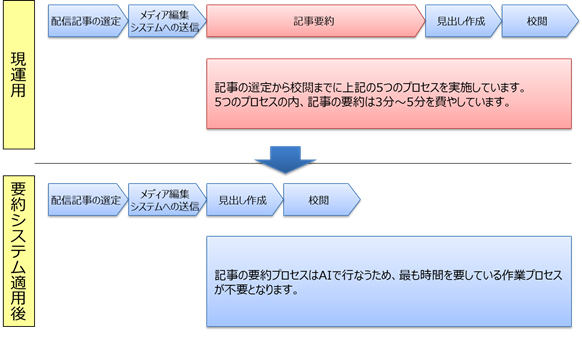 信濃毎日新聞社のCATV向けニュース配信サービスでは、これまで「配信記事の選定」、「メディア編集システムへの送信」、「記事要約」、「見出し作成」、「校閲」の5つのプロセスで実施してきました。最も時間を要するプロセスが「記事要約」で、1件あたり3分から5分を費やしています。自動記事要約システムを適用することにより、このプロセスが不要になるため、全体プロセスの約5割程度の時間短縮が期待でき、同サービスの運用の迅速化を実現します。
