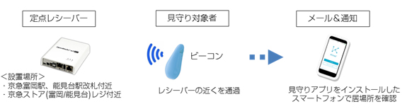 小型のビーコン端末を携帯した見守り対象者が、京急富岡駅、能見台駅、京急ストア富岡店および京急ストア能見台店の4施設に設置されたビーコン信号受信用の定点レシーバーに近付くと、家族などが持つ特定のスマートフォンに見守り対象者の位置情報と受信した時刻がプッシュ通知されます。