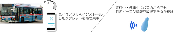 合わせて、見守りアプリをインストールしたスマートフォンが、ビーコン信号を受信するレシーバーとして機能することを生かし、路線バスを使った実証試験も行います。