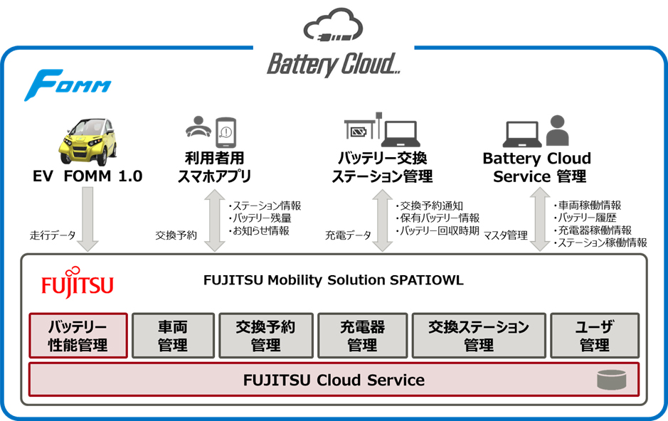 EVの走行状況やバッテリー状態、車両利用者のバッテリー利用情報、交換バッテリーの在庫情報などを統合管理し運用支援を行う機能をもつFOMMのBattery Cloud Service(バッテリークラウドサービス)の実現に向け、富士通の位置情報活用クラウドサービス「FUJITSU Mobility Solution SPATIOWL(フジツウ モビリティ ソリューション スペーシオウル)」(以下、SPATIOWL)を適用し、両社で開発を進めることで、EVを利用するための情報・電気エネルギー供給の環境を新たなモビリティ・インフラとして実現し、普及させていきます。