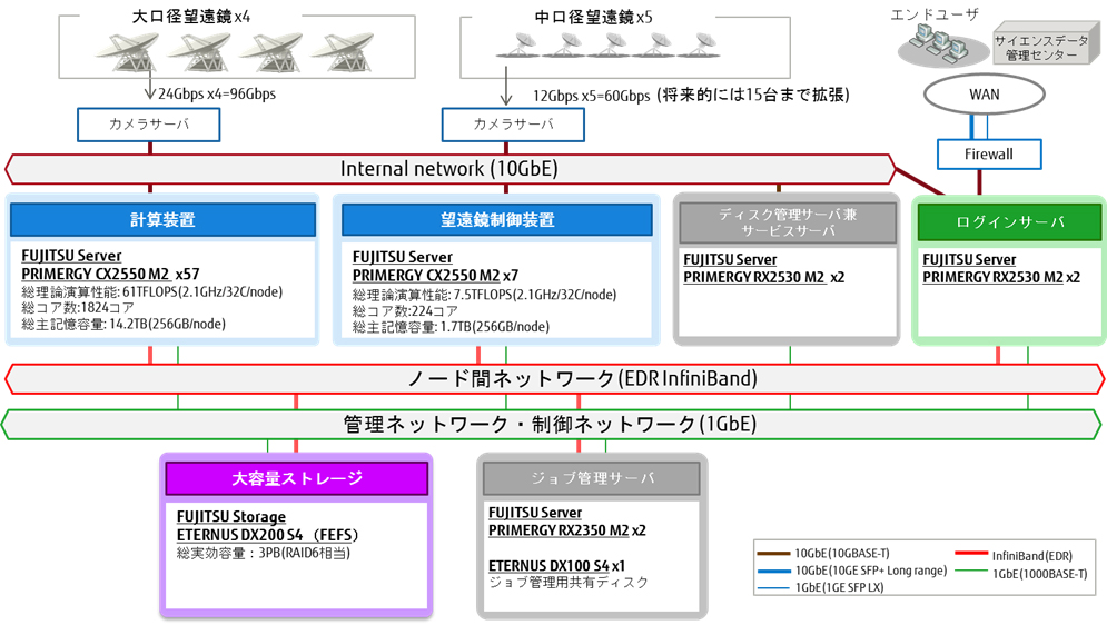 本システムは、高い性能で解析するための計算装置および望遠鏡制御装置に、当社のPCサーバ「FUJITSU Server PRIMERGY CX2550 M2」を計64台用い、2,048コアで構成しています。また、大容量データを蓄積するためのストレージに「FUJITSU Storage ETERNUS DX200 S4」を採用し、3ペタバイト を実効容量としています。さらに、高速にデータアクセスするため、計算装置および望遠鏡制御装置と大容量ストレージ間で毎秒100ギガビットの通信を可能とする高速インターコネクト「EDR InfiniBand™」を採用しております。