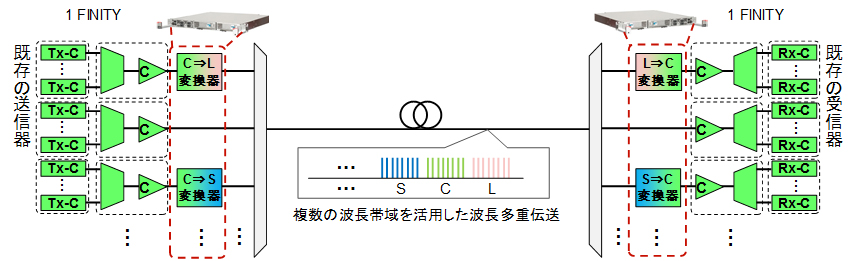 本技術を活用し、Cバンドの光信号をLバンド、Sバンドにそれぞれ変換後、Cバンドとともに多重化して送受信を行うシステムを試作し、新しい波長帯域の送受信器を使用することなく3倍の波長帯域拡大の原理確認に成功しました。この技術を用いることにより、さらに異なる帯域を用いた伝送が可能となり、必要に応じて伝送容量を2倍~10倍へと拡大することが可能となります。これにより、データセンターに設置されている送受信器だけでなく今後開発される最新のCバンド用の送受信器を、即座にCバンド以外の新しい波長帯域で活用することができるようになります。