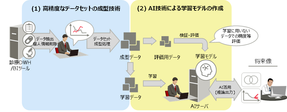 本共同研究開発は、糖尿病患者への投薬の効果をAIが予測することによる診療支援を目的としたものです。電子カルテシステムや診療DWH(注4)などに蓄積された患者の検査値や、糖尿病治療薬の一種である経口血糖降下薬の処方情報について機械学習を用いることにより、糖尿病における一般的な合併症予防の目標値であるHbA1c値(注5)7.0%未満となるよう、治療の効果を予測する技術の開発を目指します。
