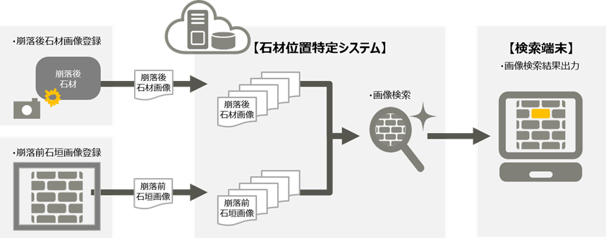 画像から石材の部分のみの切り出しや、石材や石垣の表面の明るさなどの特徴を際立たせる画像最適化技術を適用することで検索の精度を高め、その後、一つの石材全体もしくは部分的に一致する画像を抽出する高速部分画像検索技術によって、崩落後の石材が崩落前の石垣のどの位置のものか、より類似度の高い画像を特定する一連の流れを繰り返し行い、精度の向上および検索時間の短縮に取り組みました。