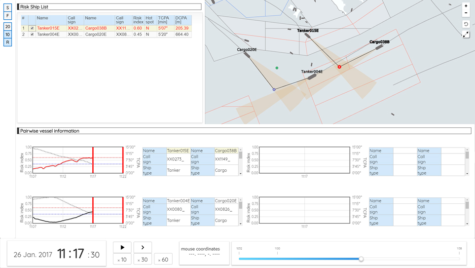 当社の衝突リスク検知技術により、管制官がリスクを認知するより前に、そのリスクをより高精度に定量化できることが確認できました。これにより、ニアミスの起こる10分前に、本技術が潜在的なリスクを検知し注意を促すことで、管制官が船舶への注意喚起などを実施するための5分ほどのリードタイムの確保、また、人間が見落としがちな衝突リスクも正確に検知し、警告することもできました。