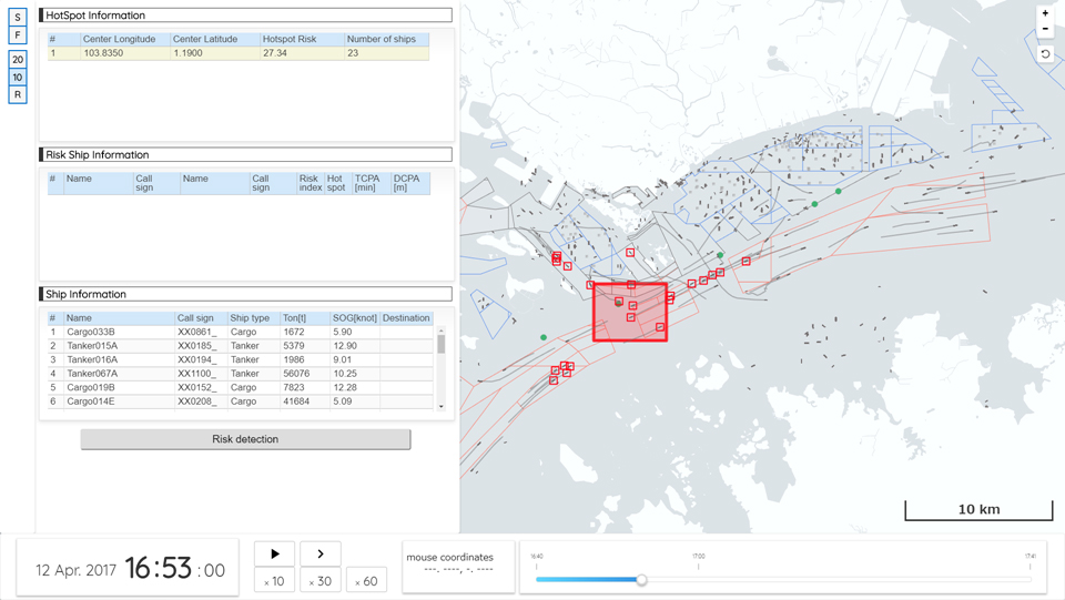 当社は、2018年4月よりシンガポール海事港湾庁(注1、以下 MPA)の協力のもとで進めてきた、シンガポール海峡の海上交通リスクを分析する実証実験を通じて、このたび、船舶同士のニアミスを予測するAIを活用した、船舶の衝突リスク予測技術の有効性を検証しました。