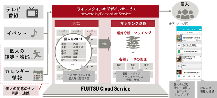 本活動の一環として両社は、個人に関わる「時間」と「趣向」のデータを活用し、個人にあったライフスタイルをデザインする実証実験を、2019年8月に実施します。本実証実験では、データは自分自身がコントロールすべきという考えのもと、両社が参加者に、自分自身のデータを自分の生活のために活用することを体感いただくため、参加者が利用許諾した自身のGoogle カレンダーのデータを活用し趣味・趣向のデータをマッチングさせてライフスタイルを提案します。また、本実証実験に向けて構築するサービスでは、個人が安心してデータを取り扱うことを可能にする富士通のPDS(Personal Data Store)サービスである「Personium(ペルソニウム)(注3)」サービスを基盤とし、電通が提唱する「タイムフィリング(注4)」という考えのもとで富士通が開発したアプリケーションを使用します。