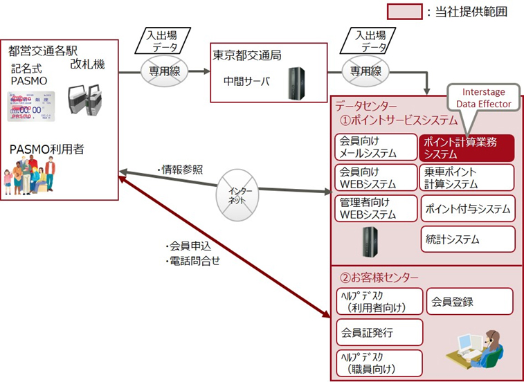- 「ToKoPo」に登録している「PASMO」利用者の入出場データを収集し、会員情報とポイント付与条件に照らし合わせて会員ごとのポイントを計算し「ToKoPo」に付与するシステム。