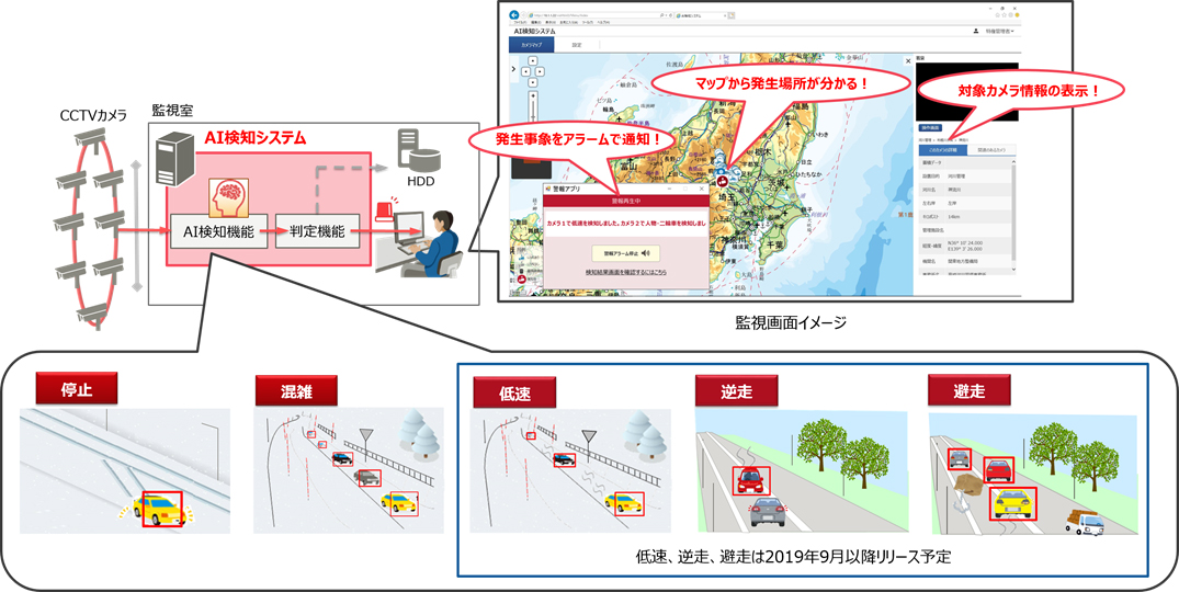 「AI検知システム」は、AIのディープラーニング技術により車両を検知し、車両の停止や混雑、低速、逆走、避走(注2)などの事象判定ロジックと組み合わせることにより、それらの事象を自動検知します。さらに自動で道路監視員にアラームで通知することで、迅速な対応につなげることが可能となり、監視業務を支援します。