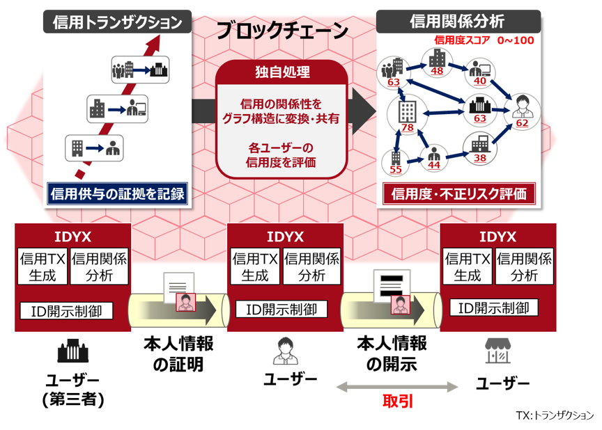今回、ブロックチェーン技術を拡張し、分散型IDの仕組みの上で、実際に取引を行ったユーザーからの評価やこれまでの取引の実態などから、取引相手の信用性を確認可能な形で本人情報を安全に流通させる技術「IDYX」を開発しました。