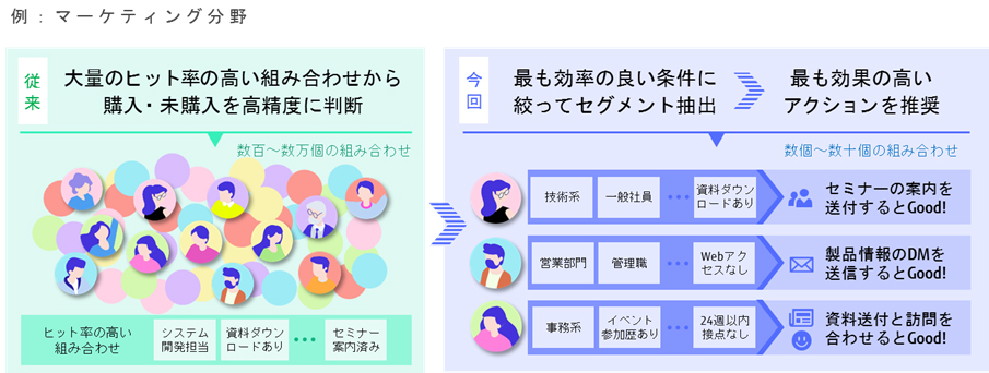 例えば、従来のマーケティングの分野では、商品を購入する見込みが高い顧客を予測するためにAIが活用されてきましたが、実際の現場では、予測だけではなく、購入の可能性を高めるアクションの決定にもAIを活用したいという課題があります。そのため、今回、富士通研究所が2018年9月に発表したAI技術「Wide Learning」を拡張し、購入者の割合が高く、顧客数が多いセグメントとアクションの組み合わせを抽出する技術を新規に追加しました。