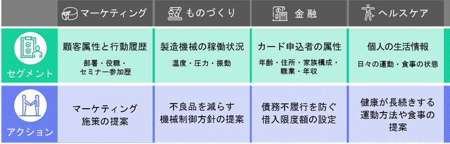 マーケティング分野の顧客へのプロモーションを例とした場合、一般的な従来のやり方として、データ項目(「顧客の属性」、「過去の行動履歴」、「アクションの実施履歴」)の組み合わせを使って過去のデータを分析します。アクションプランを決める際には、購入率が高く顧客数が多いセグメント(「顧客の属性」、「過去の行動履歴」のデータ項目からなる組み合わせ)に対して、購入につながると思われるアクションを推定しています。