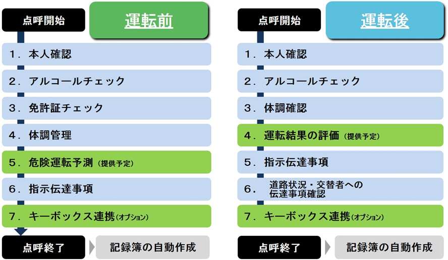 また、オプションのキーボックス連携機能により、運転者が酒気帯びや体調不良と判断された場合は、乗車する車の鍵を解錠不可とし危険な運転を未然に防ぐなど、確実な安全運転履行を支援します。