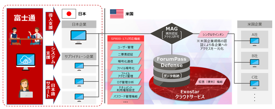 当社は今後、米国のデータセンターから提供されているExostar社の「MAG」や「ForumPass Defense」を、当社クラウドサービス「FUJITSU Cloud Service for OSS」へ実装することにより、CUIを国内に留めた形で日米防衛・航空宇宙産業界のサプライチェーンに要求される安心・安全なセキュリティ対策を実現し、お客様を支援していきます。