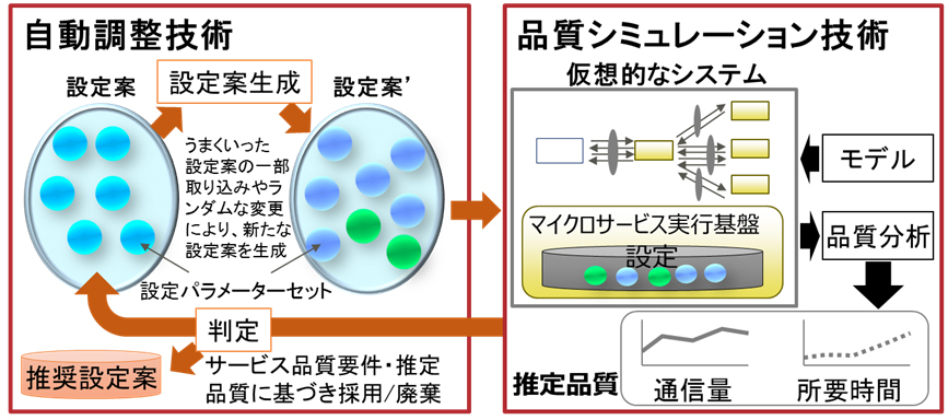 生物の進化過程を模擬した解の探索手法である遺伝的アルゴリズムと品質シミュレーション技術を組み合わせ、サービスの品質要件を制約条件に、個々のマイクロサービスに与えるCPU・メモリ割当量やリトライ回数といった設定パラメーターの最適な組み合わせを探索する技術を開発しました。これにより、サービス品質と個々のマイクロサービスの品質を両立する設定パラメーターを迅速に導出でき、たとえば、遅延が起こった場合に、利用者を不満に思わせない通信のタイムアウトの時間設定や、通信を停滞させないための優先度が低いサービスの切り離し時の動作決定など、自動で調整することができます。