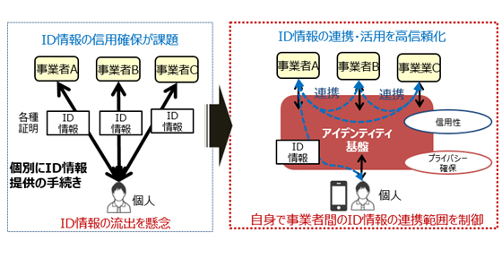 近年、サービスやビジネスプロセスのオンライン化が進展し、オンライン取引が急速に増加する中、事業者ごとに管理されている氏名や住所、年齢や経歴などユーザーのID情報を事業者間で連携・活用していくニーズが高まっています。一方、このような事業者間のID情報の相互運用の実現に向けては、ID情報のプライバシーの保護と、信用性の担保を両立することが大きな課題になっています。