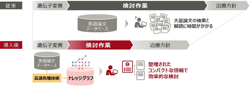 がんゲノム医療では、遺伝子変異から治療方針を導き出す検討作業に多大な工数がかかっています。開発したAI技術では、様々な表現で記述された大量の論文から、治療方針につながるナレッジをその効果などの関係性も含めて抽出することで、ナレッジグラフ型のデータベースを構築できます。今回の実証実験で本技術を活用したところ、東大医科研の血液腫瘍内科において、急性骨髄性白血病の治療方針の検討作業を半分以下に削減でき、作業の効率化および高度化できることを確認しました。