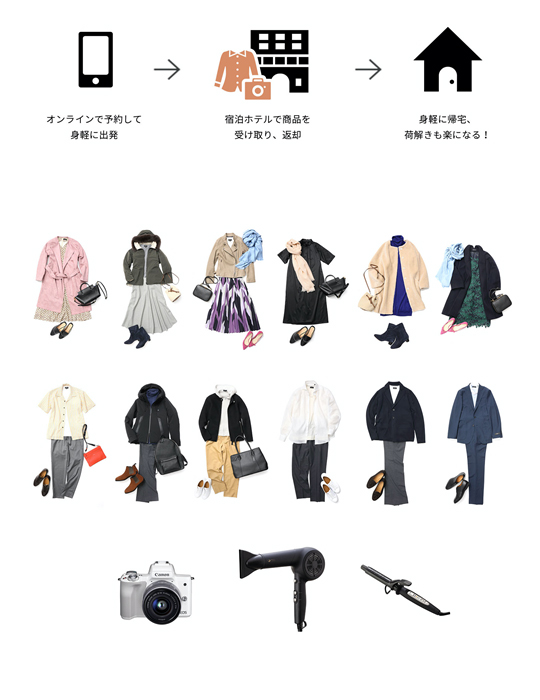 旅先で厳選した服・靴・カメラ・ドライヤーなどを提供&返却
