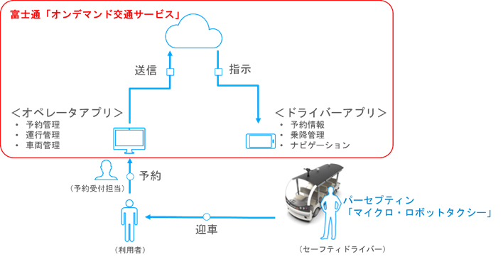 パーセプティンと富士通は、2019年6月3日より開始したFUJITSU ACCELERATOR (注4)第7期へのパーセプティンの参加をきっかけに、「マイクロ・ロボットタクシー」と「オンデマンド交通サービス」を連携させることで、地域における交通サービスやビジネスモデルを両社で模索してきました。今回、本実証実験において、利用者の予約、配車、定員管理、車両位置情報監視を実現する富士通の「オンデマンド交通サービス」を活用し、自動運転で周遊する車両を複数停留所での乗降ニーズに応じ効率的に配車することが可能となるかを検証します。