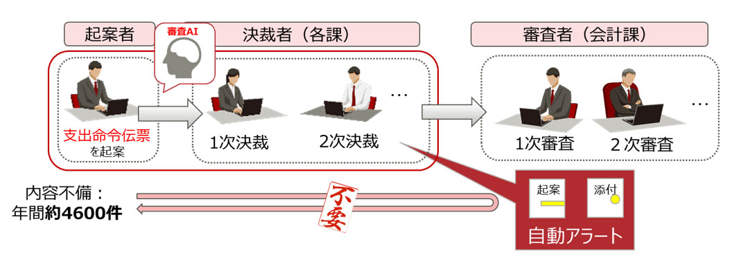 - 支出業務における決裁・審査は、起票部門の決裁を経て会計課の出納審査部門が審査しており、実証では起票部門の決裁時にAIを活用。過去の支出命令伝票を学習したAIが請求書を分析し、確認対象項目内容(添付漏れや印鑑の押印漏れ)を検知。その結果を活用し、起案直後にシステム上で起案者や決裁者に自動通知。