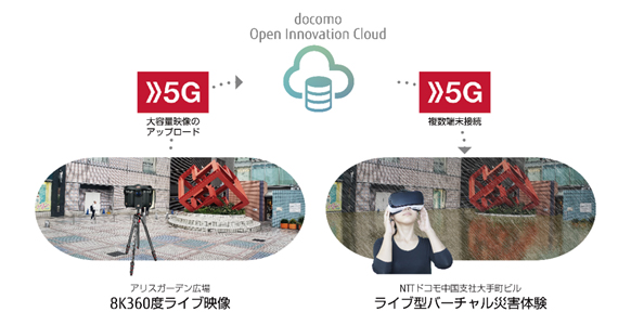 - 8K360度カメラでライブ撮影を行い、高速大容量の5G回線でドコモオープンイノベーションクラウドに映像をアップロードし、クラウド上の配信サーバから5G経由で映像を配信、VRゴーグルで映像を受信し再生するシステムを構築。