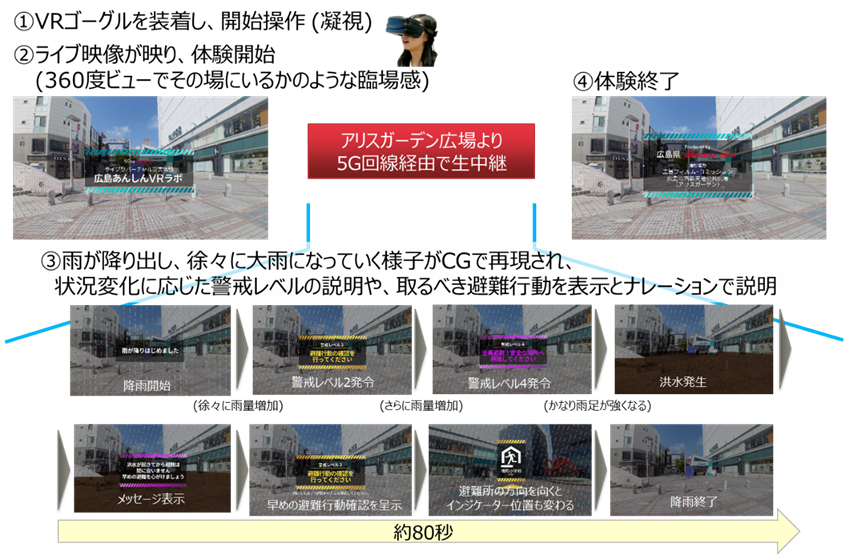今回のバーチャル災害体験では、360度ライブ映像に豪雨災害を想定したコンピュータグラフィックス(CG)を重ね合わせることで、災害発生時の街の変化の360度映像視聴体験ができます。さらに映像を視聴しながら同時に画面上に文章で示された防災や避難方法を学ぶことで、視聴者の防災意識向上を図ることをめざしています。このたび、広島市西新天地公共広場(住所:広島県広島市、以下、アリスガーデン広場)に設置した8K 360度カメラから5G回線を通じて360度映像のライブ配信を行い、富士通とドコモの社員10名がこのアプリケーションによる360度映像視聴体験しました。