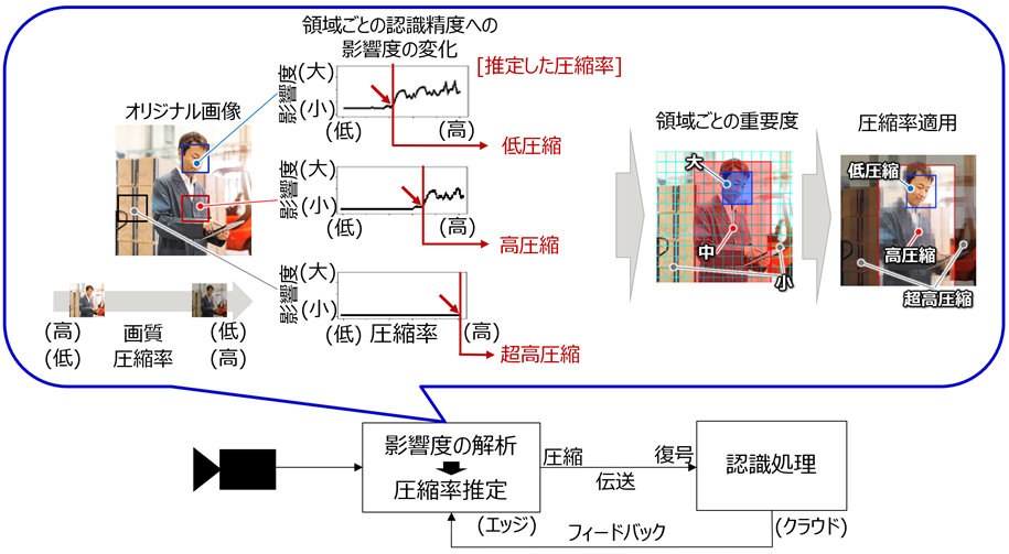 映像を圧縮すると圧縮率に応じて画質が劣化するため、AIが注目している領域を過度に圧縮すると認識率が低下します。今回、映像データ1コマ1コマの画像において、AIが判断材料として認識している対象物の領域を自動的に解析し、領域ごとにAIが認識できる必要最低限な画質で圧縮(注3)を行う映像圧縮技術を開発しました(図1)。本技術を適用することで、AIでの認識精度を維持したまま、従来の人間による視認を目的とした圧縮技術に比べて映像データのサイズを大幅に削減できます。
