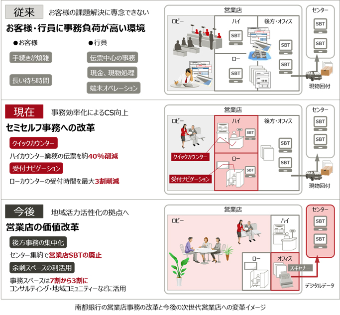 南都銀行は、今後スキャナーを活用することで、営業店後方事務を別拠点の集中センターへ集約するなど、事務ルール・体制の見直しを図りながら後方のSBT端末を削減していきます。現在、1ヵ店での試行を、エリア統括店(法人店)に拡大し検証していきます。ハイカウンターは「Quick Counter」、ローカウンターは「FrontSHIP」「BranchAPIs」「neXessary」によるタブレット活用と合わせて、営業店SBT端末の廃止を推進していきます。営業店SBTの廃止により、営業店の事務スペースが従来と比べて7割から3割に削減される見込みで、余剰スペースは地域貢献や異業種連携の利活用を検討するなど、地域課題を解決する次世代営業店への変革を進めていきます。
