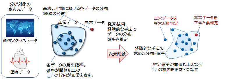 多くの業務で用いられるデータは、高次元データであり、データの次元数が増えると、データの特徴を正確に捉えるための計算の複雑さが指数関数的に増大してしまうことが、「次元の呪い(注2)」として広く知られています。近年、これを回避する手法として、ディープラーニングを使って入力データの次元を削減する手法が有望とされていますが、削減した後のデータ分布や発生確率を考慮せずに削減していたため、データの特徴を忠実に獲得できておらず、AIの認識精度の限界や誤判定が発生するといった問題がありました(図1)。これらを解決し、高次元データの分布・確率を正確に獲得することが、AI分野における重要な課題の一つとなっています。
