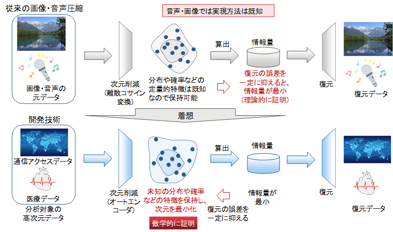 今回、この理論から着想を得て、通信アクセスデータや医療データなど、分布・確率が未知の高次元データに対し、その次元をニューラルネットワークの一つであるオートエンコーダ(注4)で削減した後、また復元したときに、元の高次元データと復元後のデータとの間の劣化を一定値に抑えつつ、次元削減後の情報量を最小化したデータは、元の高次元データの特徴を正確に捉え、かつ、次元を最小限に削減できていることを世界で初めて数学的に証明しました。