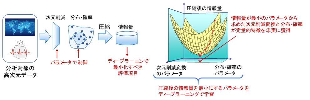 一般にディープラーニングは、最小化したい評価項目を定めると、複雑な問題でも評価項目が最小となるパラメータの組合せを求めることが可能です。この特徴を利用し、高次元データの削除すべき次元数と削除後のデータの分布を制御するパラメータを導入し、圧縮後の情報量を評価項目に定め、ディープラーニングで最適化しました。これにより、上記1の数学理論に基づいて最適化されたときの次元を削減したデータの分布および確率は、データの特徴を正確に捉えることが可能となります。