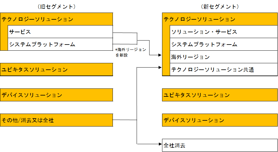 「その他/消去又は全社」について、全社共通費用を「テクノロジーソリューション共通」、セグメント間売上の消去を「全社消去」として分割するとともに、前者を「テクノロジーソリューション」に統合しました。その結果、今後は「テクノロジーソリューション」、「ユビキタスソリューション」、「デバイスソリューション」という3つのセグメントと、セグメント間売上の消去のみとなる「全社消去」という区分となります。