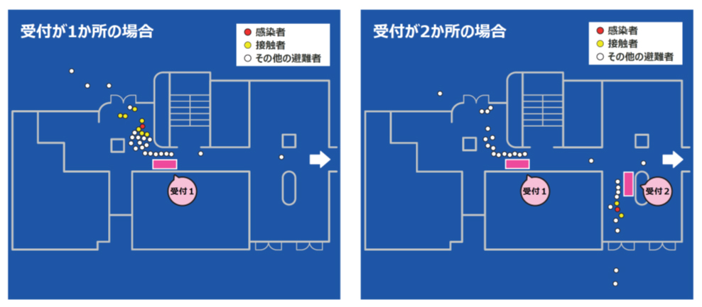 4者は、本技術により、新型コロナウイルス禍における様々な避難所運営計画をシミュレーションします。具体的には、避難所受付の設置数や受付要員数の違いといった避難所運営の相違に応じて変化する感染リスクを評価し、その中から状況に応じた適切な避難所運営の実施計画を検討します。
