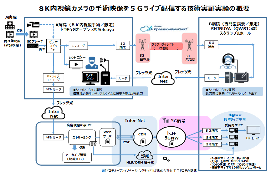 一般財団法人NHKエンジニアリングシステム(注1、以下 NHKエンジニアリングシステム)、株式会社三菱総合研究所(注2、以下 三菱総合研究所)、富士通株式会社(注3、以下 富士通)は、一般社団法人映像配信高度化機構(注4、以下 映像配信高度化機構)と株式会社NTTドコモ(注5、以下 NTTドコモ)と連携し、8K内視鏡カメラであらかじめ撮影した手術中の8K映像を、「4K8K高度映像配信システム」を活用し、第5世代移動通信システム(以下 5G)経由で遠隔地に伝送する技術実証実験を、令和3年3月17日(水曜日)と18日(木曜日)に実施しました。