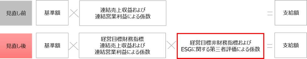 当社は、業績連動報酬として短期業績に連動する報酬の賞与、株主価値との連動を重視した中長期インセンティブの業績連動型株式報酬を設定しています。現在、いずれの報酬においても当社の経営目標財務指標として掲げる連結決算における売上収益と営業利益を評価指標として選定していましたが、経営目標達成へのコミットメントを高め、それに報いるために、今般、2022年度以降に係る賞与の評価指標に「非財務指標」、業績連動型株式報酬の評価指標に「EPS(一株当たり当期純利益)」を追加することとしました。