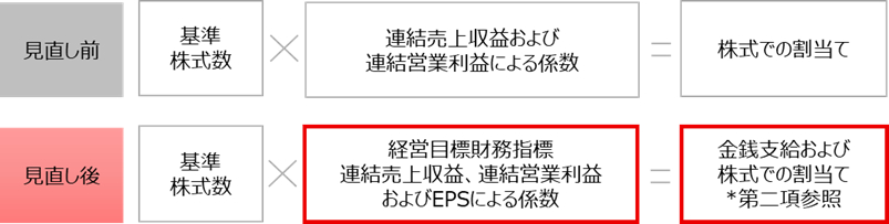 業績連動型株式報酬に、当社の経営目標財務指標である「EPS」を評価指標として追加します。具体的な評価方法および算出方法は、あらかじめ職務および職責に応じた基準株式数を設定し、それに対して財務指標である連結売上収益、連結営業利益およびEPS の業績判定期間(3年間)中の業績目標の達成度合いに応じた係数を乗じて年度ごとの株式数を計算の上、業績判定期間の終了をもって、業績連動型株式報酬の支給を決定します。