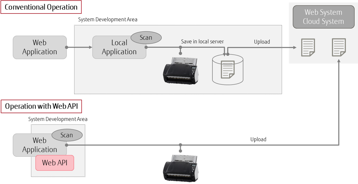 Various scanning-related operations such as adjusting scan settings, scanning and protecting data when uploading, can be added into the clients’ web applications, enabling them to complete all scanning work within their web applications. With this new API, not only is the amount of development required for customized systems significantly reduced, but user operations are also simplified and efficient.