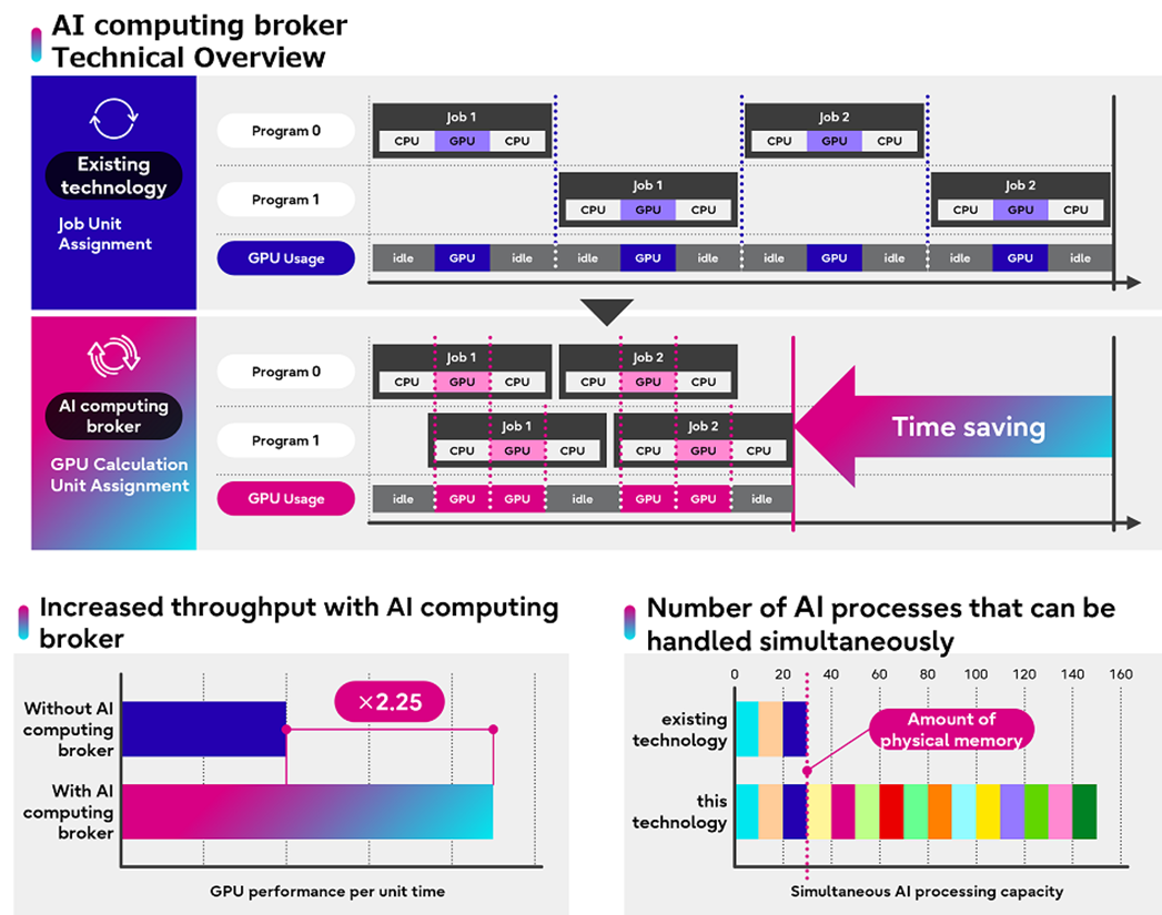 在發佈前的試驗中,富士通的AI computing broker展示了 GPU每單位時間處理性能最多提升至2.25倍。此外,其記憶體管理功能支持同時處理高達 150GB 的 AI 任務,約為實體 GPU 記憶體容量的五倍。