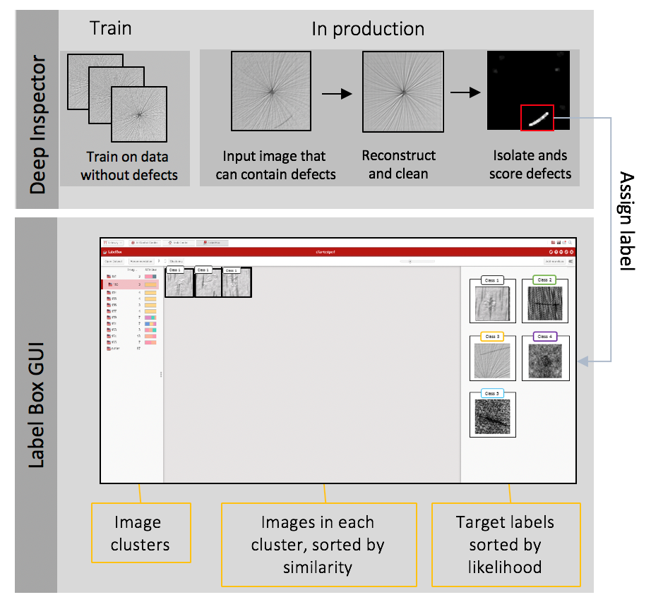 Figure 2: The two new technologies used to generate a high-quality labelled dataset. The first technology uses data without defects to automatically mark regions of interest. Labels are then assigned to these regions via LabelGearTM