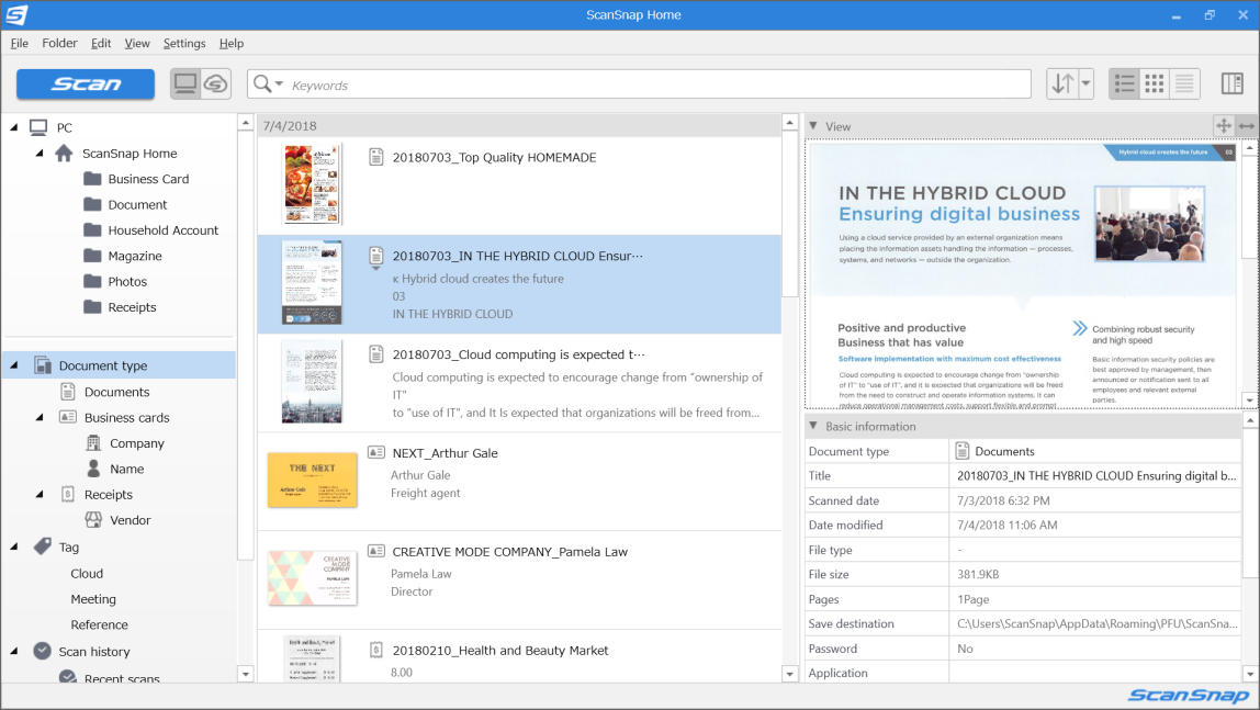 ScanSnap Home offers excellent functions to organize and search through your data by enabling the creation of folders, tags, and keywords. You can now find information you need easier than before.